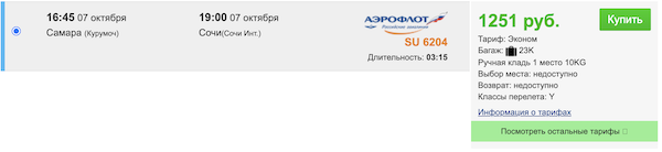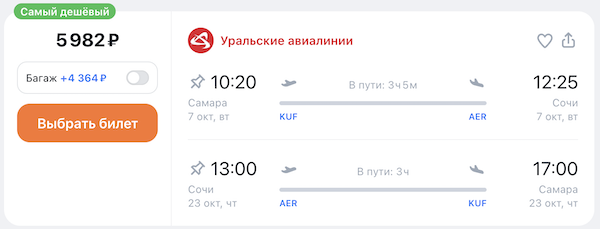 Из Самары в Сочи в октябре: 1.300 рублей в одну сторону, от 6.000 рублей туда-обратно.