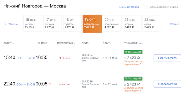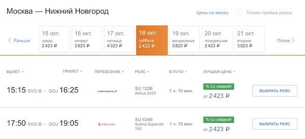 Билеты Аэрофлота между Москвой и Нижним Новгородом в октябре 4.800 рублей туда-обратно.