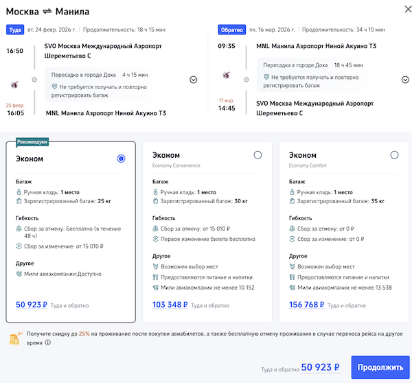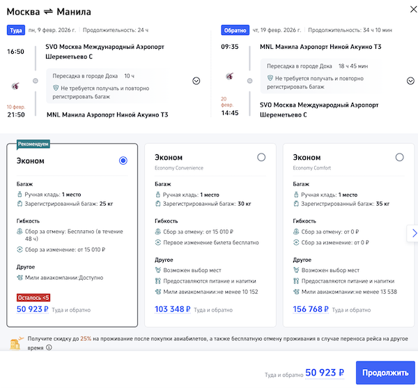 Qatar Airways: из Москвы на Филиппины 50.900 рублей туда-обратно.