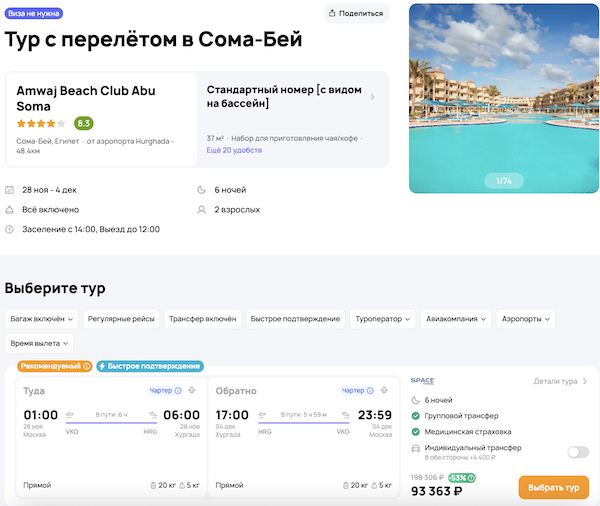 Amwaj Beach Club Abu Soma 4* 46.700 рублей за человека (93.400 рублей за двоих)