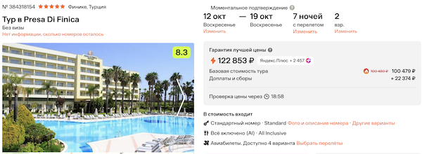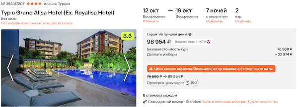 Стоимость в примерах указана за одного человека при условии поездки вдвоем, стоимость туров для одного человека можно посмотреть здесь или на страницах отелей.