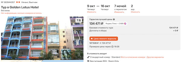 Golden Lotus Hotel 2* 67.200 рублей за человека (134.500 рублей за двоих)