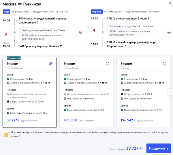 Рейсы выполняются China Eastern с пересадкой в Шанхае.