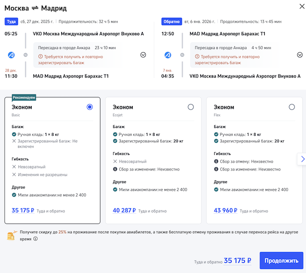 Рейсы выполняются авиакомпанией AJet с пересадкой в Анкаре: по дороге из Москвы остановка в столице Турции на сутки, обратно 5 часовая пересадка.