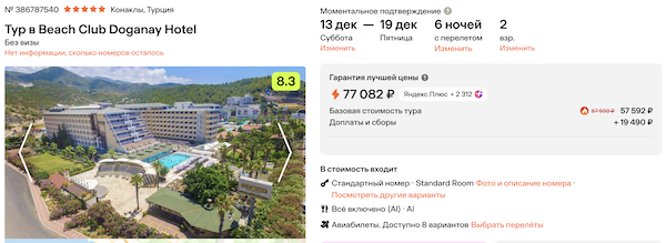 Beach Club Doganay Hotel 38.500 рублей за человека (77.100 рублей за двоих)