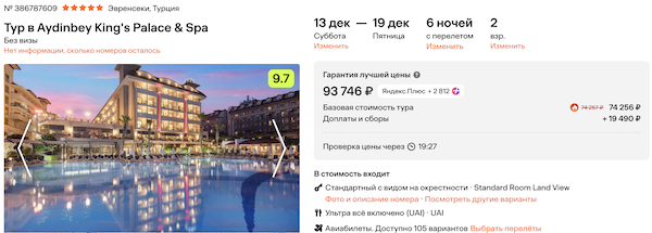 Aydinbey King’s Palace & Spa 46.800 рублей за человека (93.700 рублей за двоих)
