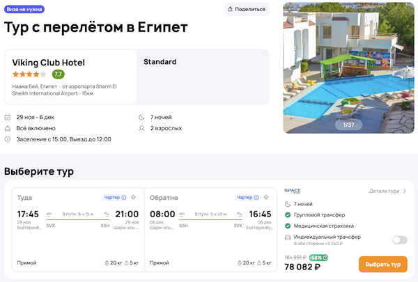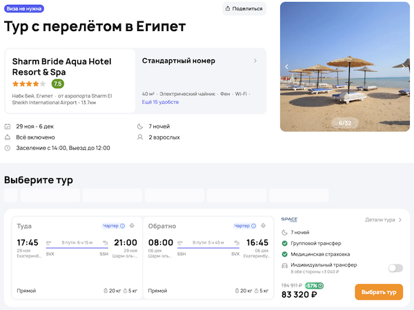 — прямой перелет в Шарм-эш-Шейх и обратно;