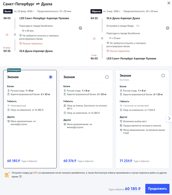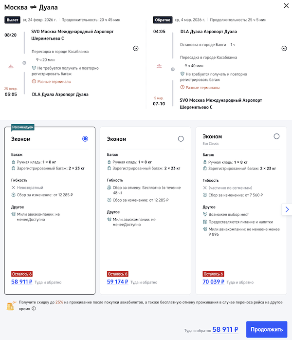 Рейсы выполняются авиакомпанией Royal Air Maroc с пересадкой в Касабланке.