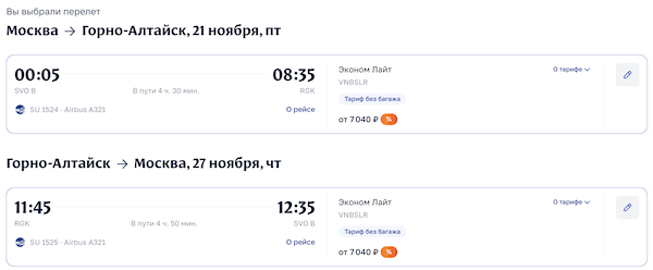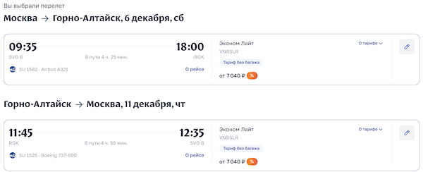 Аэрофлот: из Москвы на Алтай (Горно-Алтайск) в ноябре-декабре от 14.100 рублей туда-обратно.
