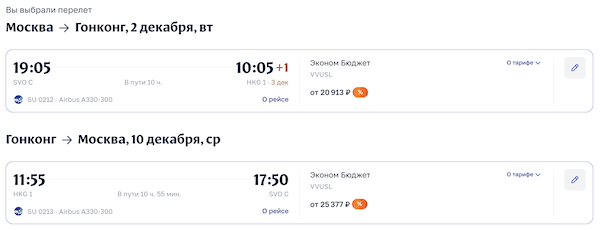 Прямые рейсы Аэрофлота из Москвы в Гонконг в декабре от 46.300 рублей туда-обратно.