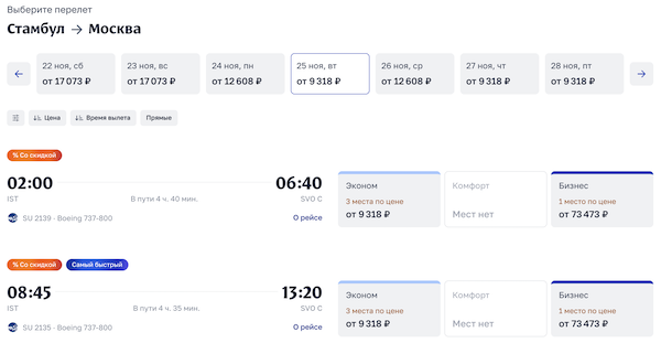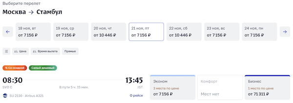 Аэрофлот: из Москвы в Стамбул в ноябре 16.500 рублей туда-обратно.