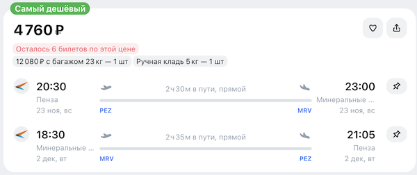 Билеты из Пензы в Минеральные Воды в ноябре-декабре от 4.800 рублей туда-обратно.