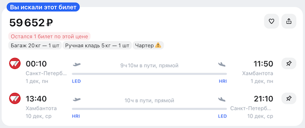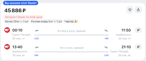 Горящие билеты на прямые чартерные рейсы из Санкт-Петербурга на Шри-Ланку от 45.900 рублей туда-обратно.