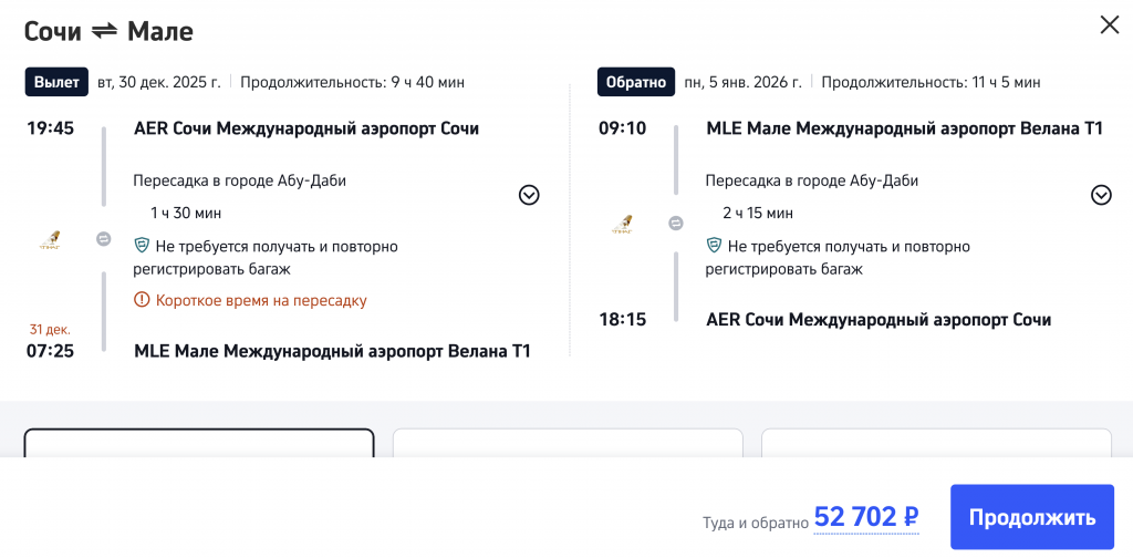 Новый год на Мальдивах: билеты из Сочи на пиковые даты 52.700 рублей туда-обратно.