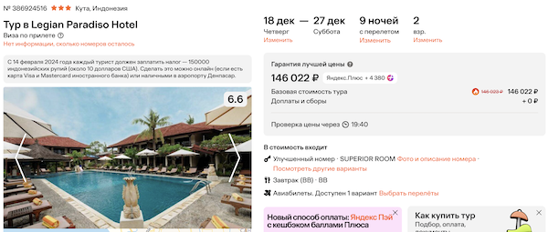 Legian Paradiso Hotel 3* с завтраками 73.000 рублей за человека (146.000 рублей за двоих)