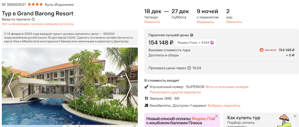 Grand Barong Resort 4* с завтраками 77.000 рублей за человека (154.100 рублей за двоих)