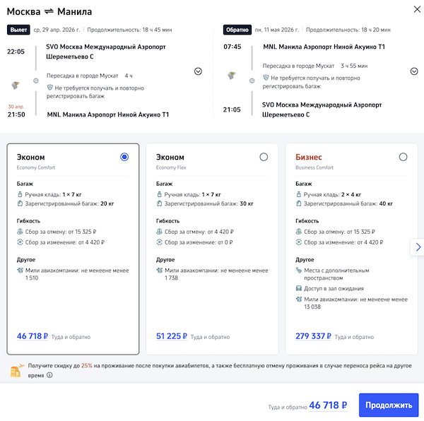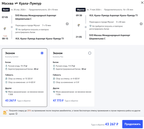 У авиакомпании Oman Air распродажа билетов на следующий год: например, из Москвы в Малайзию или на Филиппины от 43.300 рублей туда-обратно.