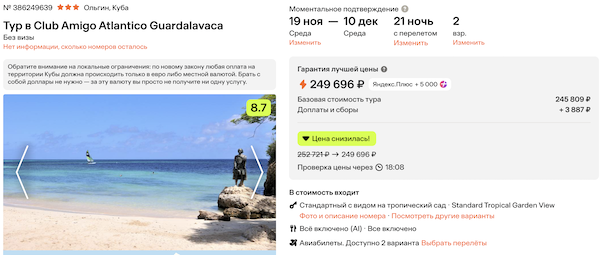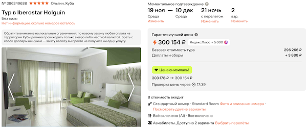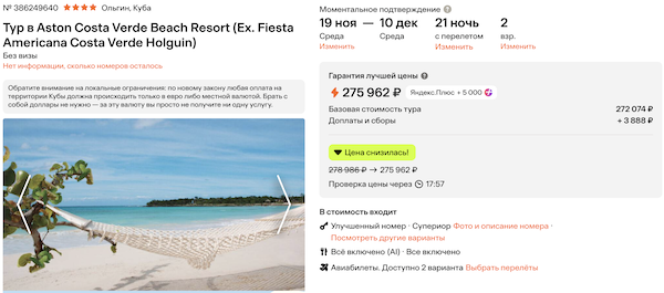 Три недели на Кубе, все включено: горящие туры из Москвы от 124.800 рублей за человека.