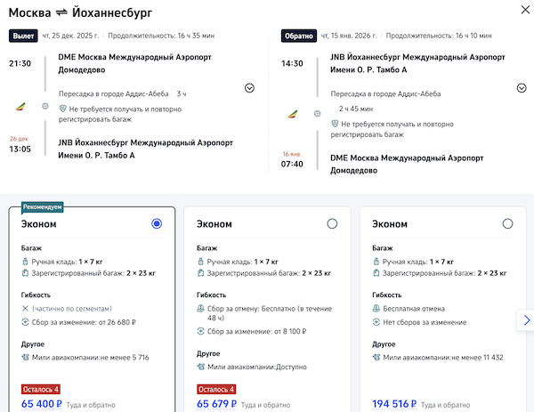 Из Москвы в ЮАР (Йоханнесбург) на Новый год 65.400 рублей туда-обратно.