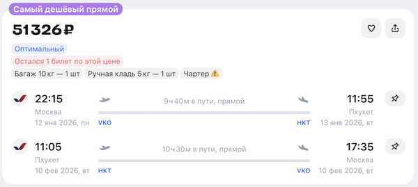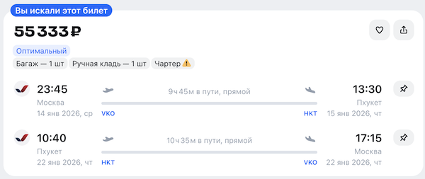 Прямые чартерные рейсы из Москвы на Пхукет в январе-феврале от 51.300 рублей туда-обратно.