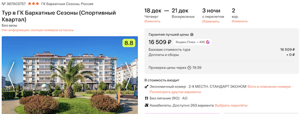 Бархатные Сезоны (Спортивный Квартал) 3* 8.200 рублей за человека (16.500 рублей за двоих)