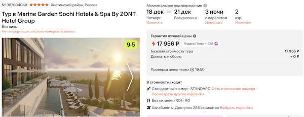 Marine Garden Sochi Hotels 5* 9.000 рублей за человека (18.000 рублей за двоих)