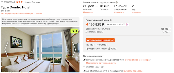 Стоимость в примерах указана за одного человека при условии поездки вдвоем. Стоимость туров для 1 человека можно посмотреть здесь или на странице отелей, изменив количество туристов.