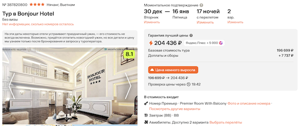 Bonjour Hotel 4* с завтраками 102.200 рублей за человека (204.400 рублей за двоих)