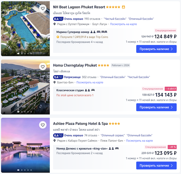 Отели с оплатой российской картой на трип.ком. Например, двухместные номера на даты поездки: