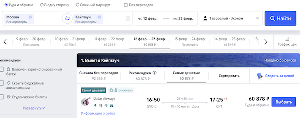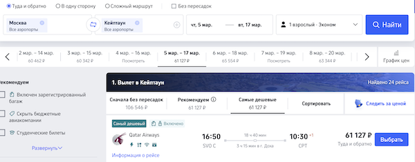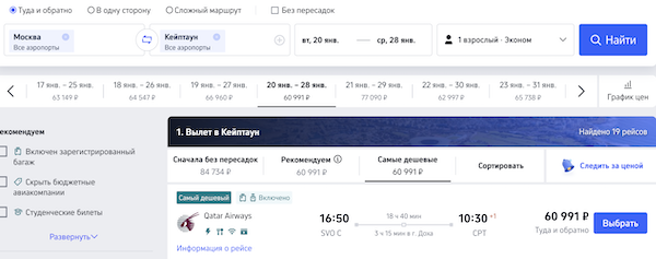 Билеты из Москвы в Кейптаун от 60.900 рублей туда-обратно.
