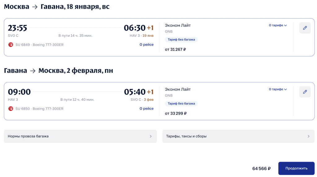 Прямые рейсы из Москвы в Гавану 64.600 рублей. Билеты на сайте Аэрофлота.