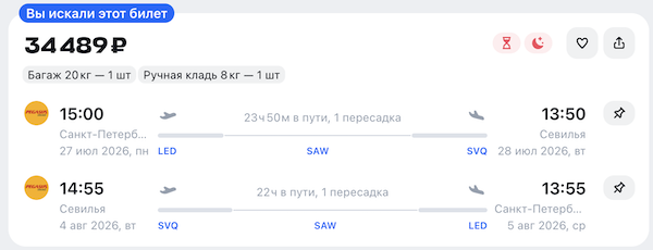 Из Санкт-Петербурга в Испанию летом: билеты в Андалусию (Севилья) в июле и августе от 34.500 рублей туда-обратно, багаж включен.