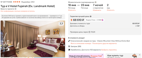 V Hotel Fujairah 4* с завтраками 34.300 рублей за человека (68.600 рублей за двоих)