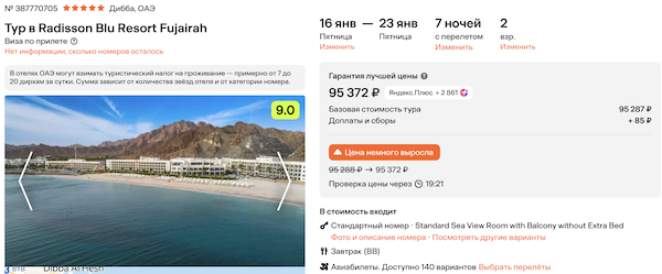 Radisson Blu Resort Fujairah 5* с завтраками 47.200 рублей за человека (95.400 рублей за двоих)