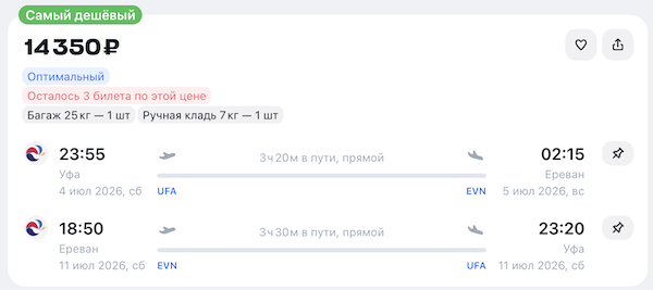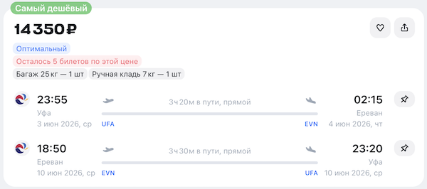 Билеты из Уфы в Ереван с апреля по сентябрь 14.400 рублей туда-обратно, багаж включен.