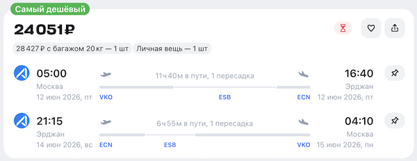 На Кипр летом: билеты из Москвы в Эрджан от 24.000 рублей туда-обратно.