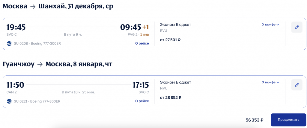 Составной маршрут: вылет в Шанхай 31 декабря, обратно из Гуанчжоу 8 января