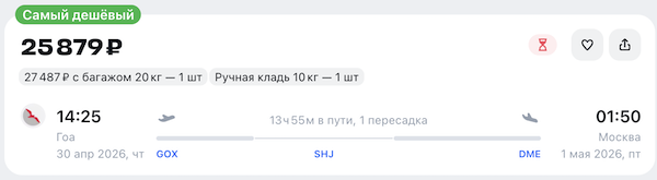 Обратные билеты на авиасейлс. Например, рейсами Air Arabia с пересадкой в Шардже от 25.900 рублей