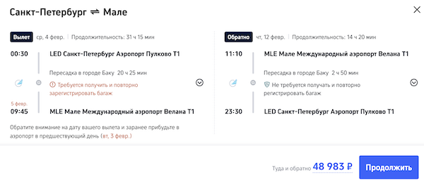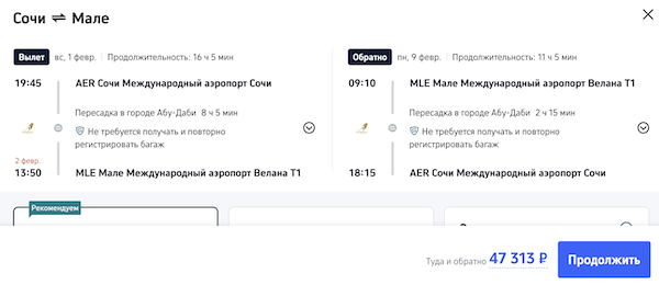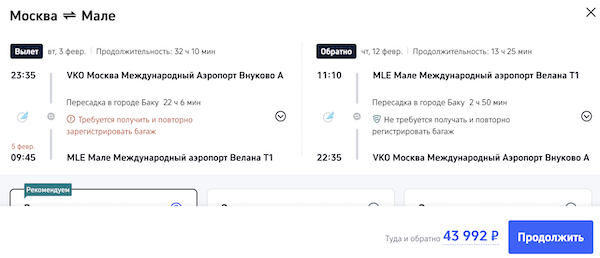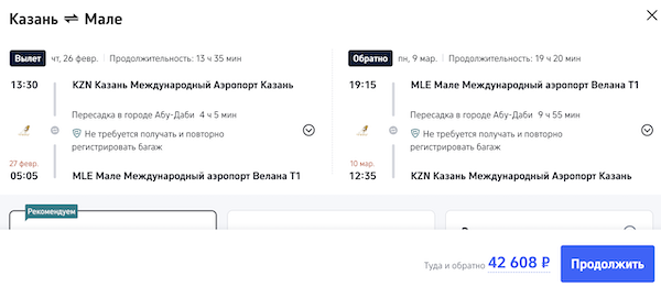 Билеты на Мальдивы из Казани, Москвы, Сочи и Санкт-Петербурга от 42.600 рублей туда-обратно.