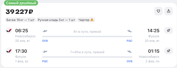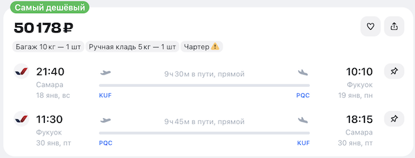 Прямые чартерные рейсы на Фукуок: из Новосибирска и Иркутска 39.200 рублей туда-обратно, из Самары 50.200 рублей.