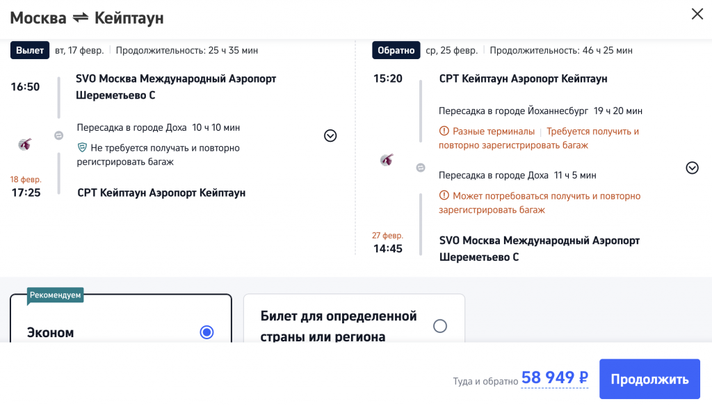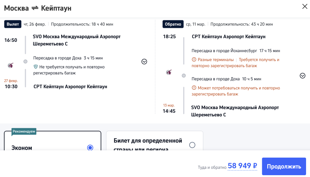 Рейсы выполняются с пересадкой в Дохе (и дополнительной стыковкой Йоханнесбурге на обратном пути).