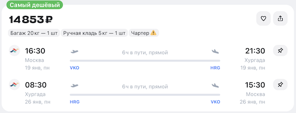Билеты из Москвы в Хургаду 14.900 рублей туда-обратно.