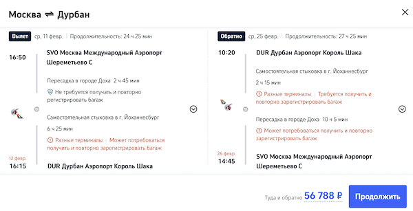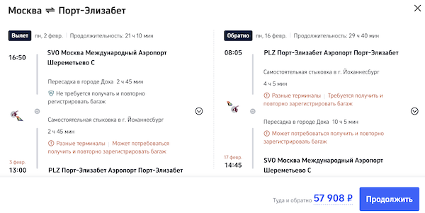 Рейсы выполняются с пересадкой в Дохе и Йоханнесбурге.