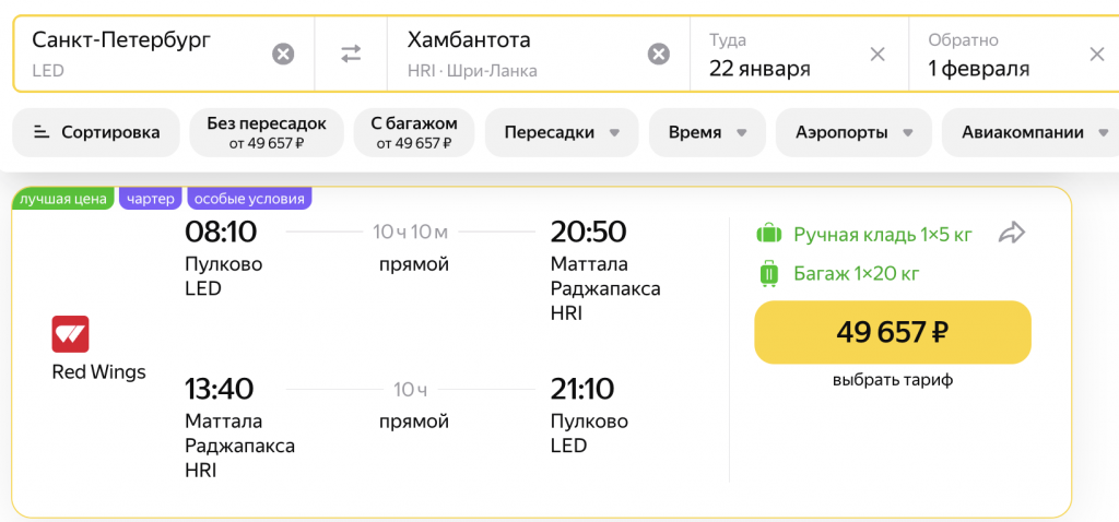 Горящие билеты на прямые чартерные рейсы из Санкт-Петербурга на Шри-Ланку 49.700 рублей туда-обратно.
