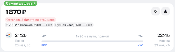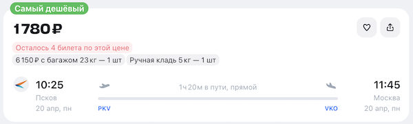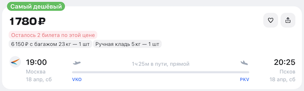 Билеты между Москвой и Псковом в апреле-мае 1.800 рублей в каждую сторону.