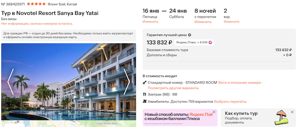 Novotel Resort Sanya Bay Yatai 4* с завтраками 66.900 рублей за человека (133.800 рублей за двоих)