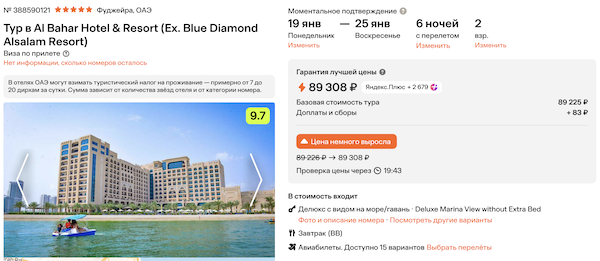Al Bahar Hotel & Resort 5* с завтраками 44.600 рублей за человека (89.300 рублей за двоих)