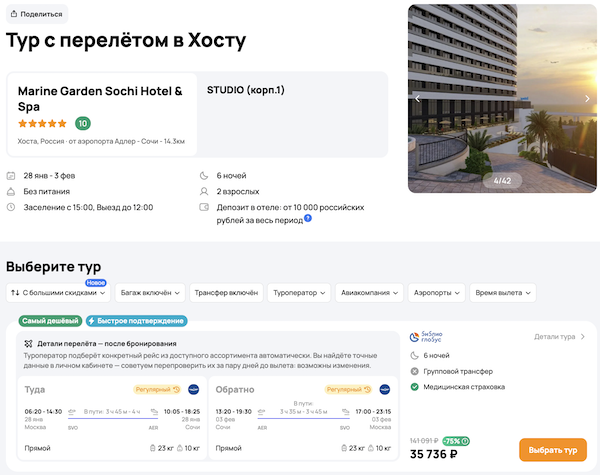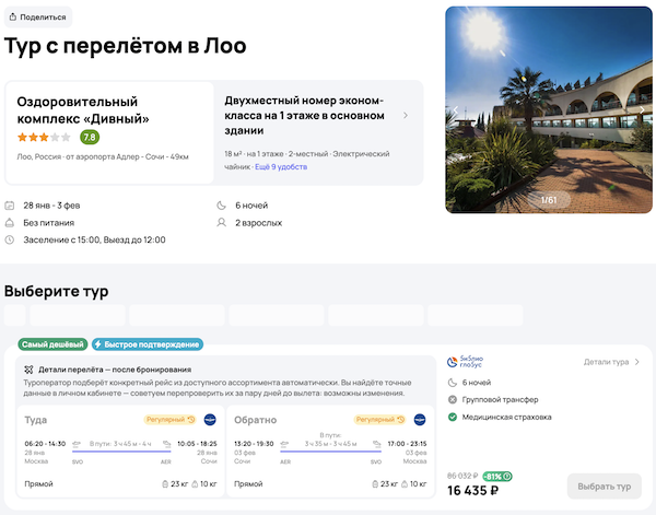 Туры из Москвы в Сочи: перелет Аэрофлотом и неделя в отеле от 8.200 рублей за человека.
