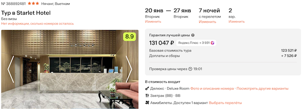 Starlet Hotel 3* с завтраками 65.500 рублей за человека (131.000 рублей за двоих)
