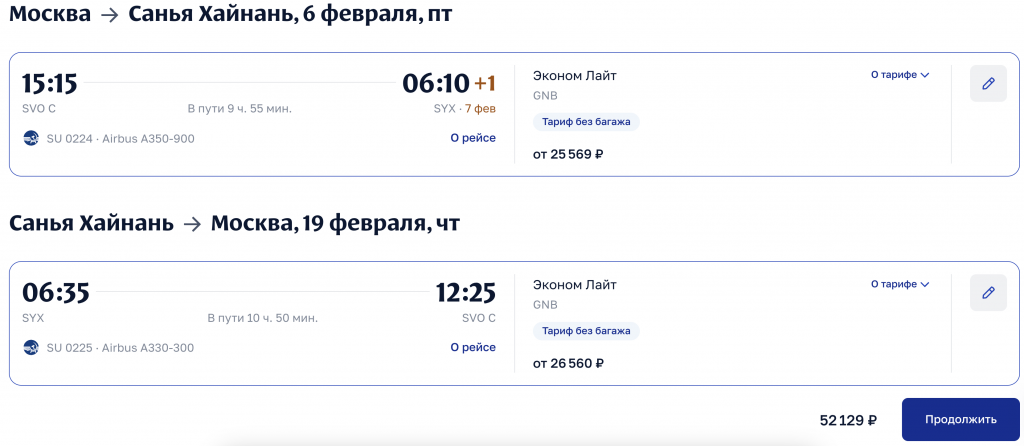 Прямые рейсы Аэрофлота из Москвы на Хайнань в феврале 52.100 рублей туда-обратно.